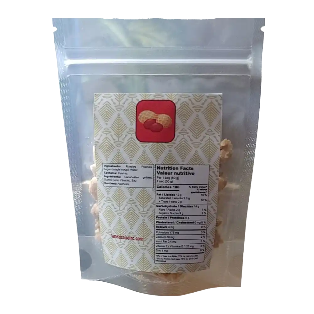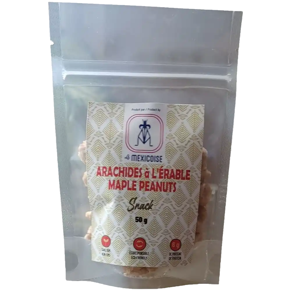 Les arachides à l’érable sont une collation populaire qui combine la saveur croquante des arachides grillées avec la douceur riche et caramélisée du sirop d’érable pur du Québec, créant un équilibre unique, enrobées d’une couche cristallisée de sucre d’érable, offrant une expérience gourmande et réconfortante, parfaite pour une collation ou un dessert. Chaque sachet de 50 g contient 6 g de protéines.