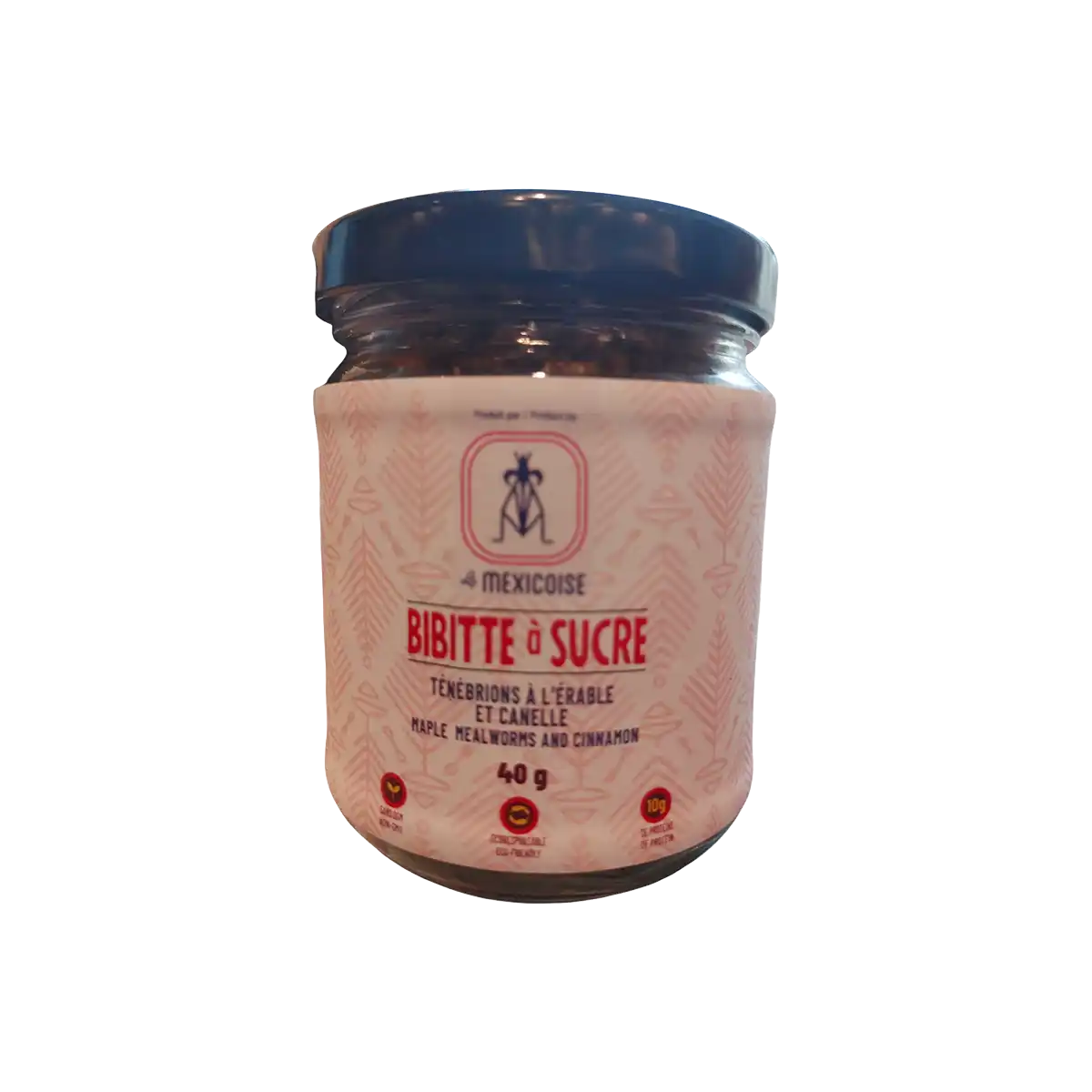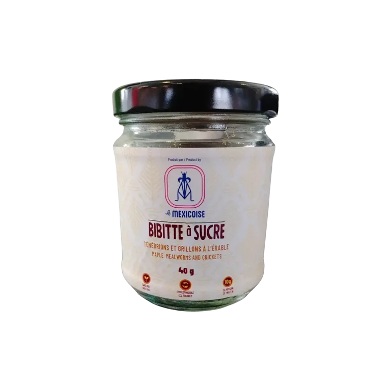 Cette délicieuse collation protéinée se compose de ténébrions québécois caramélisés dans un mélange de cannelle et de sirop d’érable 100 % naturel. Laissez-vous inspirer par les insectes comestibles et incorporez-les dans vos desserts, salades, yogourts et céréales ou consommez-les seuls pour une collation saine lors de la pause café ou de la récréation.